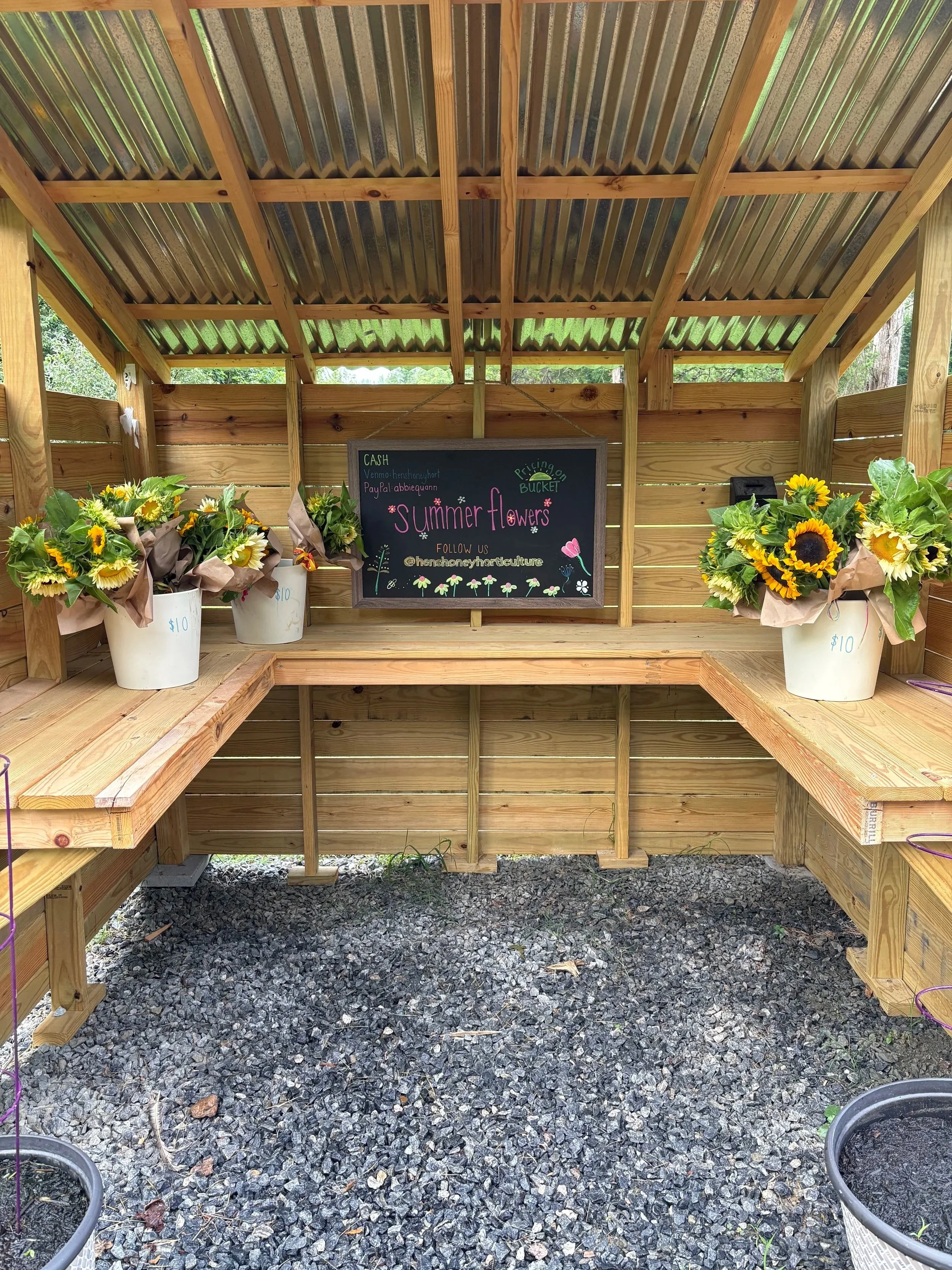 During flower season, the stand is stocked each morning with freshly cut bouquets from the garden. Flowers change throughout the season depending on what is blooming in the garden. This is a simple self-serve stand where visitors can stop by, choose a bouquet, and leave payment. Because flowers are harvested daily, availability changes quickly. Follow along on Instagram stories to see what is in the stand each morning.